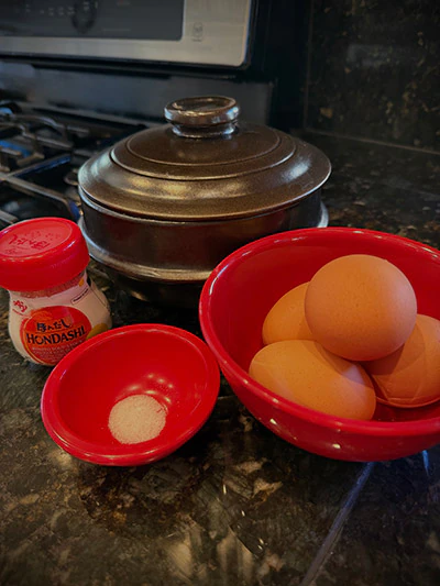 - Combine the eggs, water or broth, salt and Hondashi or fish sauce in a heat safe bowl and whisk thoroughly.